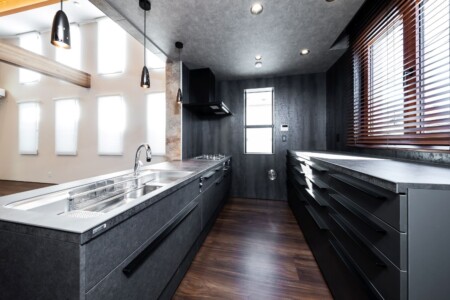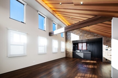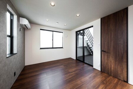 屋内は各棟異なる竜骨ストリップ階段と螺旋階段をそれぞれ採用し、吹抜け空間とすることで上下階をより一体的な空間とさせました。また、集いの場となるLDKには自然光を積極的に取り込むリズミカルな窓を配置し、明るく、外界との繋がりを持たせる空間になるよう計画しました。